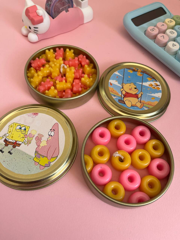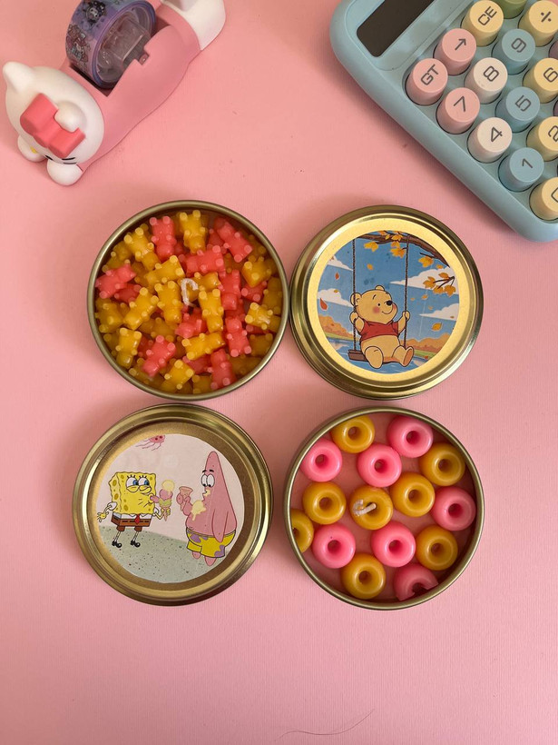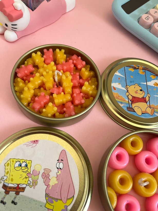 شمع قوطی فلزی طرح باب اسفنجی و دو با سوخت 6 الی 7ساعت و دارای فیتیلهی ۲۴تار میباشد با تزئین الهام گرفته از ترکیب رنگ صورتی و زرد